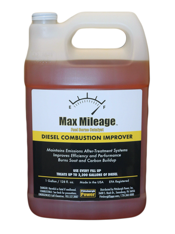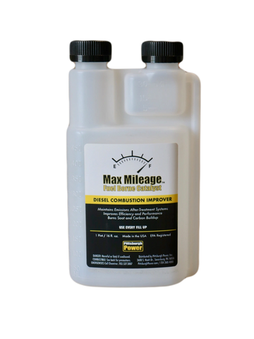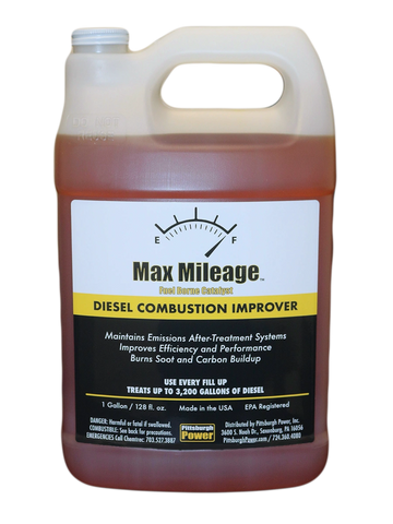 Max Mileage Fuel Borne Catalyst is a liquid fuel additive that directly improves your engine’s combustion and efficiency. Enjoy more power, smoother and quieter engine operation, less DEF consumption, higher MPGs, and fewer regens. It works by accelerating the burn of diesel so more BTUs of heat are released earlier during the power stroke instead of being wasted as soot and high exhaust gas temperature. With Max Mileage, soot emissions are drastically decreased by 60%.